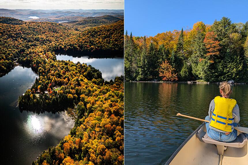 Bordé de deux lacs paisibles, le nouveau camping Huttopia se trouve au cœur du parc Éco-Laurentides, qui compte plus de 30 km de sentiers de randonnée.